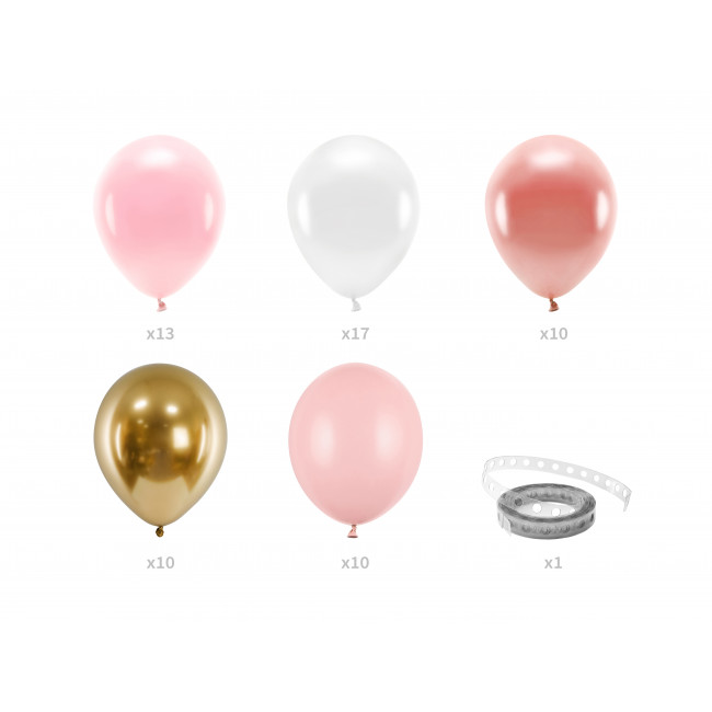 - Set sadrži ukupno 60 balona: sjajne zlatne, pastelno ružičaste, metalik rose gold, pastelno puderaste i metalik bijele.