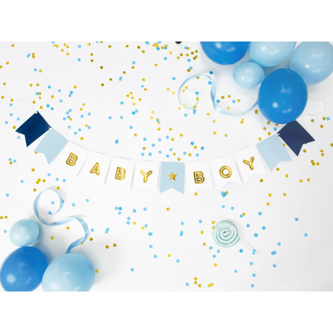 Ova moderna dekoracija savršen je dodatak za baby shower ili proslavu dolaska Vašeg malog blaga. Zlatni natpis "Baby Boy" predivno se ističe na šarenim zastavicama i cijeloj dekoraciji daje dašak luksuza i elegancije. Sastavljanje je izuzetno jednostavno i možete ga obaviti za samo nekoliko minuta.