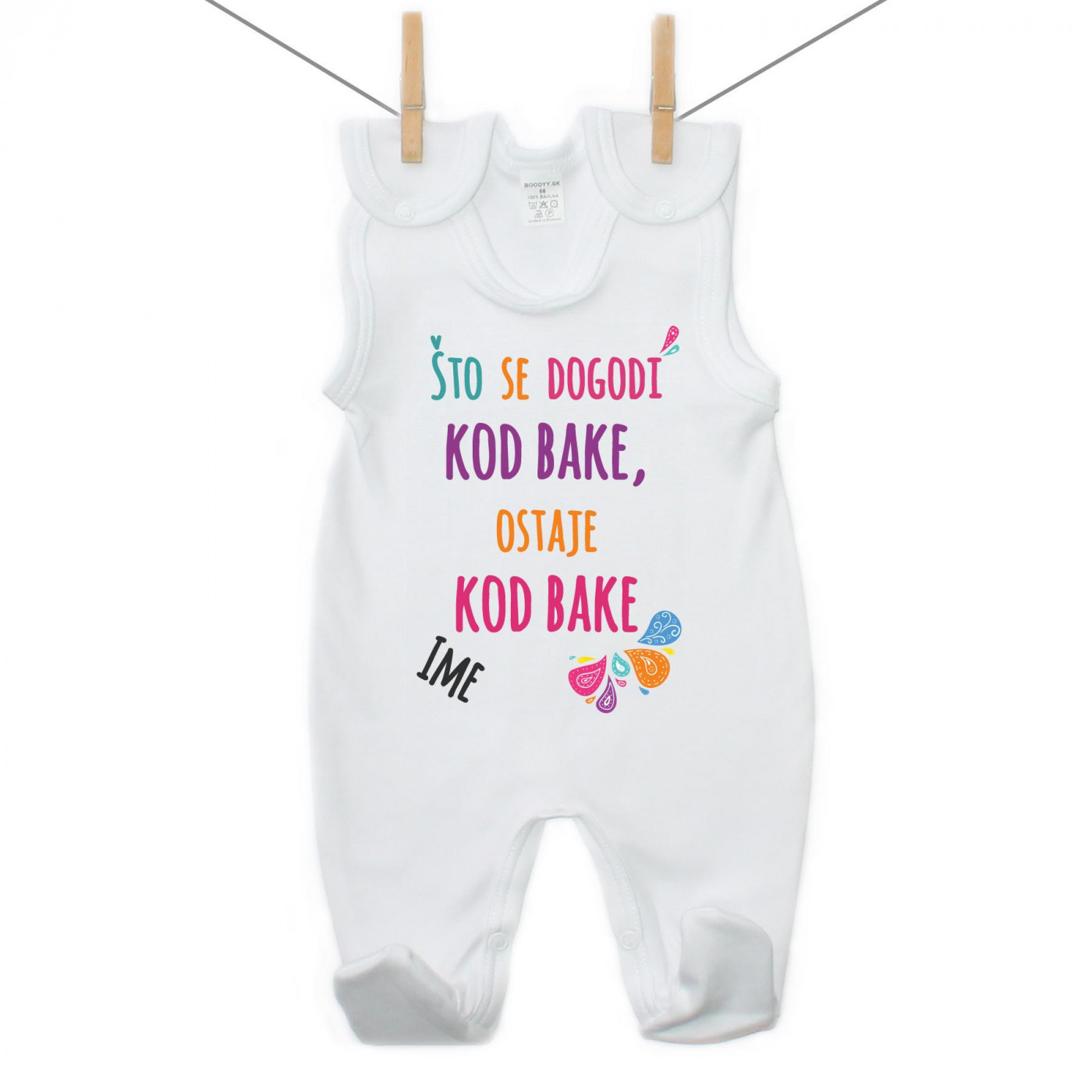 Kopčanje na ramenima i između nogavica olakšava oblačenje i presvlačenje. Dostupno u veličinama od 50 do 86 cm.