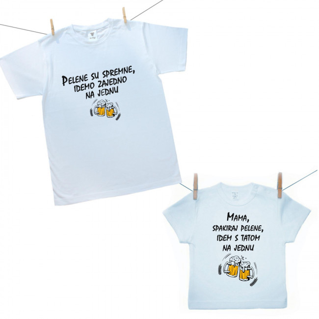Komplet uključuje udobnu majicu za tatu sa zabavnim natpisom da su pelene spremne te odgovarajuću dječju majicu s porukom za mamu da spremi opremu. Kako bi ovaj poklon bio zaista jedinstven i samo vaš, dječji komad možemo personalizirati imenom vašeg mališana. To je odličan izbor za opuštene vikende, obiteljska druženja ili kao originalan poklon koji će sigurno biti apsolutni hit.